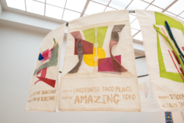 Material: cotton yarn, wool yarn, plastic yarn, cotton fabric, silkscreen ink, steel.